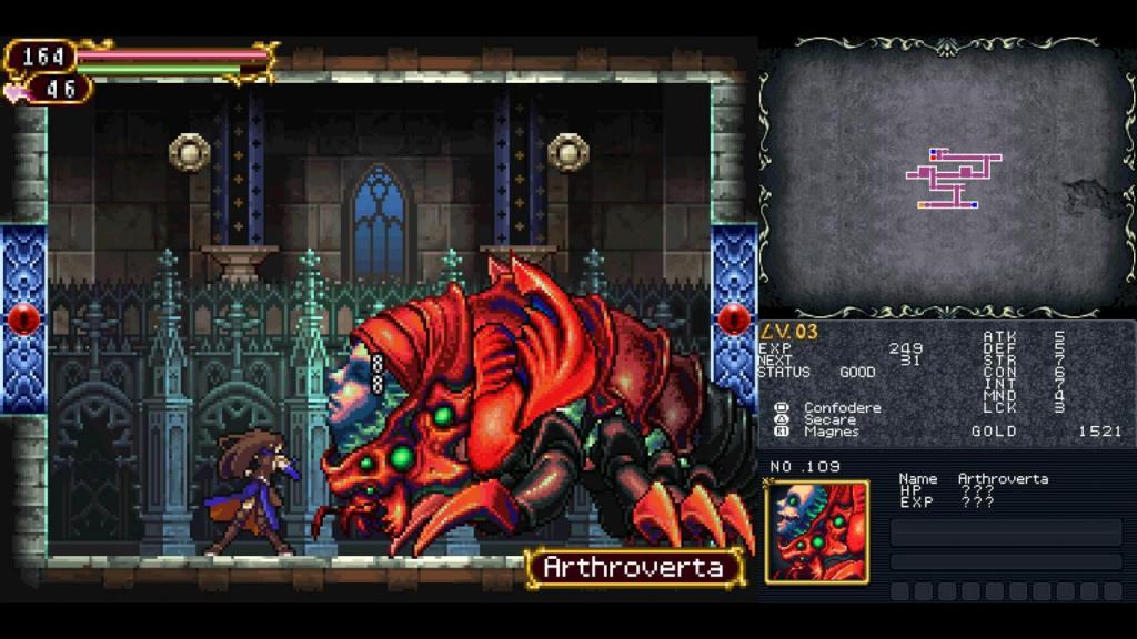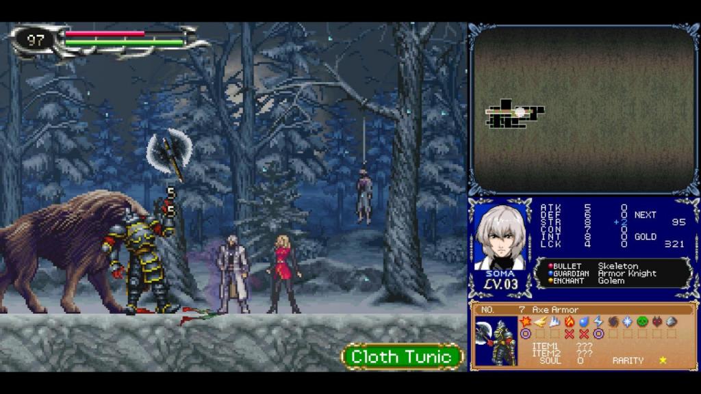Am meisten habe ich mich persönlich gefragt wie und ob man die beiden Bildschirme und die Stylus-Eingaben ohne nennenswerte Reibungsverluste portieren kann. Aber hier hat das renommierte Studio M2, das Konami abermals mit der Umsetzung beauftragt hat, ganze Arbeit geleistet. Es gibt gleich mehrere Möglichkeiten sie beiden Bildschirme, bzw. die dort hinterlegen Informationen gleichzeitig anzeigen zu lassen und für den Stylus hat man die Möglichkeit den Curser per rechtem Stick zu bewegen, oder wie es im Spiel umgesetzt wurde, diese Eingaben durch normale Buttons zu ersetzen. Das ist gerade bei „Dawn of Sorrow“ eine wahre Erlösung, da man dort im Original bei jedem Boss eine immer komplizierter werdende Zeichenfolge zeichnen musste und jeder Fehler dem Boss Lebensenergie zurückgab und die Kämpfe unnötig in die Länge zog.