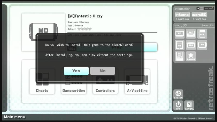 - Damit öffnet man das System und lässt die ROMs, die ohnehin für die Emulation ausgelesen werden, auch nach dem Wechsel eines Moduls auf der SD Karte, wo hingegen sie sich beim Stock UI nur im Zwischenspeicher befinden und beim Herausnehmen des Moduls gelöscht werden. Die Handhabe ist dann analog zum „Retro-Freak“: wahlweise kann man die ROMs speichern, kann seine Bibliothek auf der SD Karte verwalten, Spiele auch ohne Modul spielen und die ROMs über einen PC exportieren.