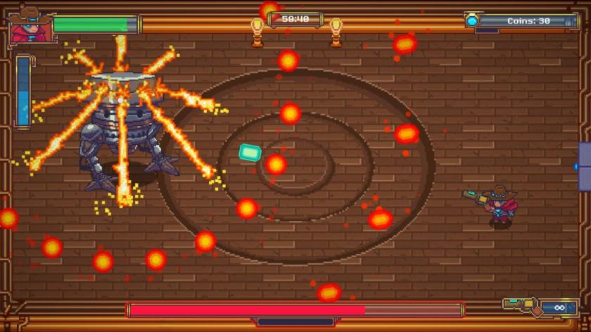 Das Gameplay des Spiels ist auf rasante, strategische Action ausgelegt. Der Twin-Stick-Shooter-Ansatz ermöglicht es den Spielern, gleichzeitig zu laufen und zu zielen, während sie sich durch zufallsgenerierte Level kämpfen. Jeder Durchlauf ist einzigartig, da die Gegnerplatzierung, Deckungsmöglichkeiten und Belohnungen variieren. Spieler können zwischen verschiedenen Waffen wechseln – von klassischen Revolvern und Schrotflinten bis hin zu futuristischen Plasma-Werfern und EMP-Granaten. Besonders spannend sind die Cyber-Upgrades, die Jericho im Laufe des Spiels erwerben kann. Sein mechanischer Arm kann mit einer Greifhaken-Funktion ausgestattet werden, die es ihm erlaubt, blitzschnell zwischen Deckungen zu wechseln oder Gegner heranzuziehen. Ein weiteres Upgrade ermöglicht einen Zeitlupenmodus, ähnlich wie in „Max Payne“, wodurch Gegner leichter ausgeschaltet werden können. Der Schwierigkeitsgrad ist von Beginn an fordernd, aber fair – besonders die Bosskämpfe sind Highlights des Spiels. Hier treten Spieler gegen gigantische kybernetische Revolverhelden oder mechanische Bestien an, die Bullet-Hell-artige Angriffsmuster nutzen.