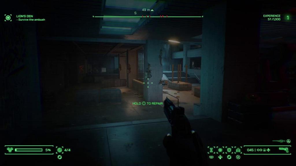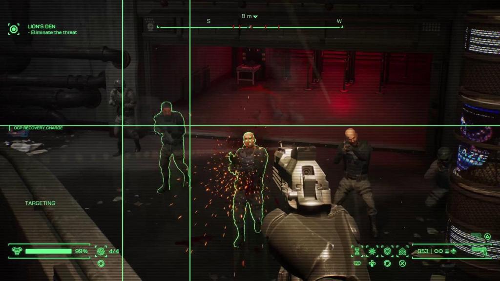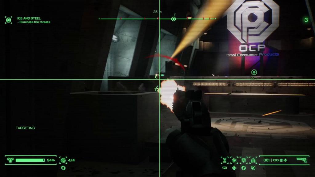 Das Gameplay ist spürbar straffer und actiongeladener als im Hauptspiel. Während „Rogue City“ noch versuchte, offenere Areale und investigative Elemente einzubauen, konzentriert sich die Erweiterung fast ausschließlich auf Gefechte. Es gibt zwar auch eine paar offenere Bereiche und optionale Untersuchungen als Nebenquest, aber diese sind eindeutig nur zur Auflockerung da und keineswegs mehr der Fokus des Polizeialltags. Im Gegensatz sind die Kämpfe das absolute Highlight des Spiels und wurden im Gegensatz zum ersten Teil massiv erweitert. Dabei trumpft sie mit einer Reihe neuer Gegnertypen auf, die das Gameplay abwechslungsreicher gestalten: Da sind die „Vanguard“-Söldner mit schweren Schilden, die RoboCop frontal blockieren, agile Jetpack-Cyborgs, die von oben attackieren, sowie samuraiartige Kämpfer mit futuristischen Katana. Diese Gegnertypen zwingen den Spieler, die gewohnten Methoden anzupassen, anstatt stumpf das ikonische Auto-9 auszupacken.