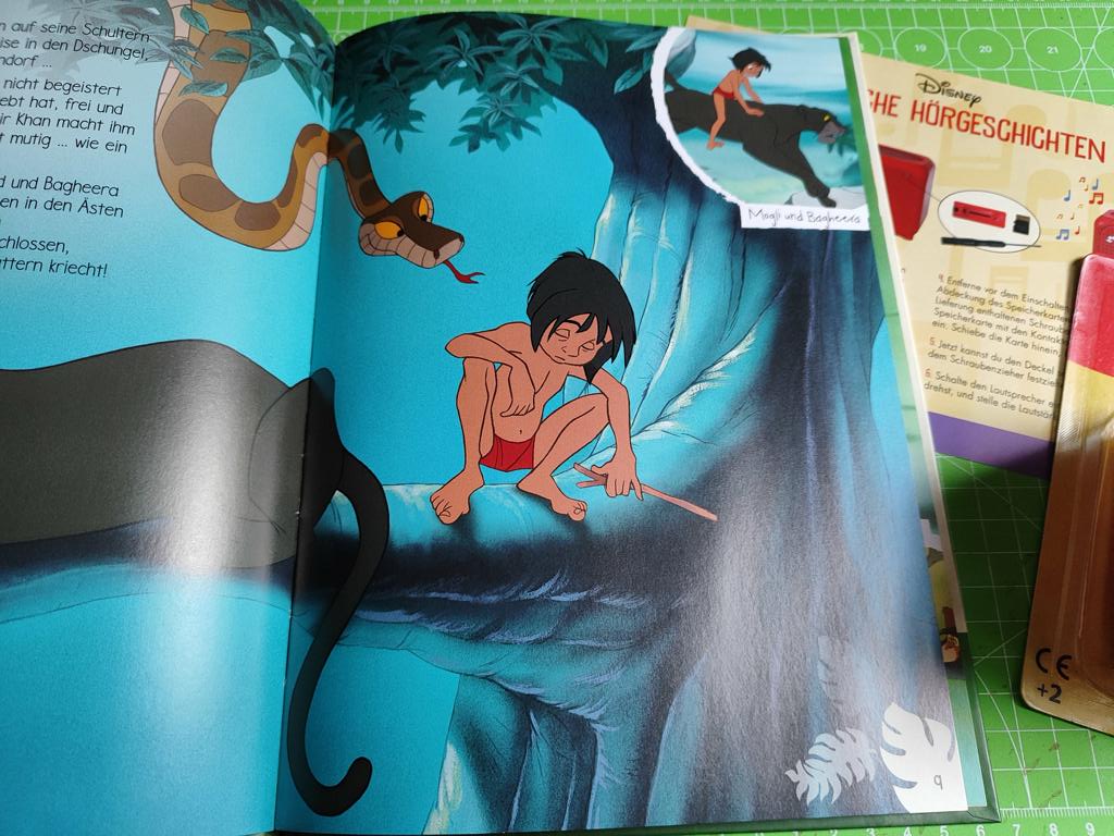 - Ein Buch im A4-Format mit fast 30 Seiten. Es erzählt die Geschichte von Mowgli nach – mit vielen bunten Bildern und kurzen Texten, perfekt zum Vorlesen oder Blättern mit den Kids.
