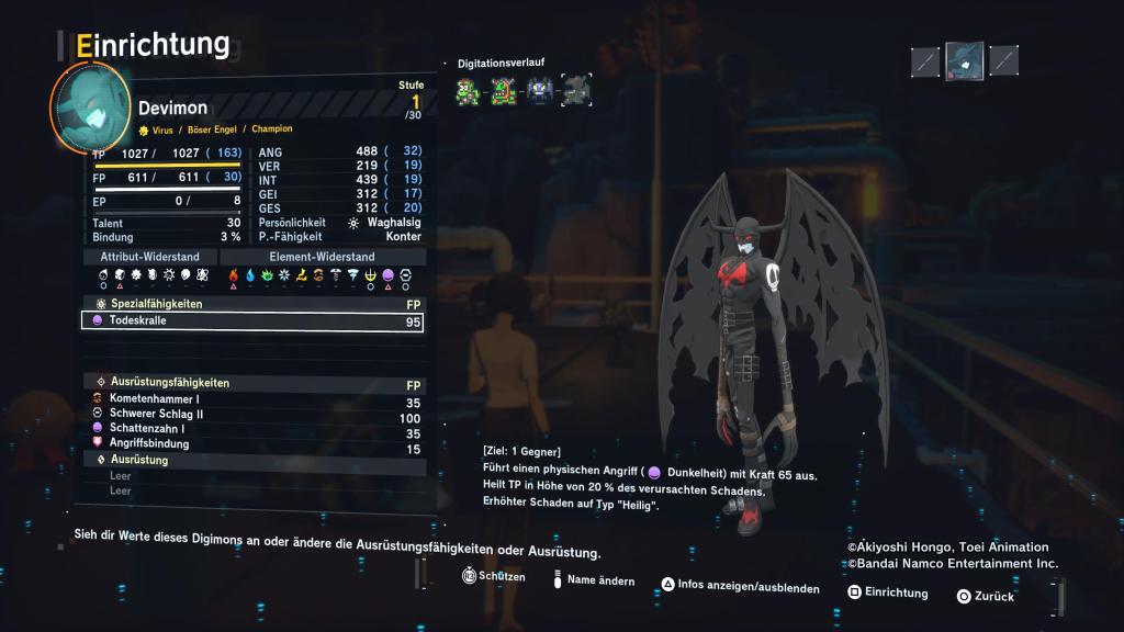 Ein Highlight für viele Spieler dürfte die Art und Weise sein, wie man Digimon gewinnt und weiterentwickelt. Statt Monster einfach zu „fangen“, sammelt man während der Kämpfe Datensätze über Gegner. Hat man genug Informationen gesammelt, lassen sich diese Daten in neue Partner umwandeln, je höher der Prozentsatz, desto stärker das Resultat. Das Digivolution-System wiederum bietet unzählige Pfade, manche sofort sichtbar, andere erst nach und nach freischaltbar. Diese Offenheit sorgt für echte Freiheit in der Teamentwicklung und macht jedes Digimon einzigartig. Besonders clever ist die Möglichkeit, Digimon zurückzuentwickeln, um alternative Evolutionslinien zu verfolgen, ein Feature, das experimentierfreudige Spieler lieben werden.