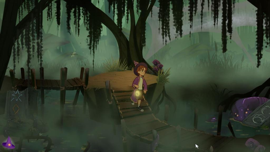 Visuell ist das Spiel ein kleines Kunstwerk. Anstatt den heute beliebten Retro-Pixelstil zu wählen, entschieden sich die Entwickler für vollständig handgezeichnete 2D-Kulissen mit sanften 2,5D-Effekten. Jede Szene wirkt wie ein liebevoll animiertes Gemälde, von den leuchtenden Zauberwäldern über düstere Bibliotheken bis hin zu verfallenen Türmen, in denen magische Apparate vor sich hin surren. Die Farbpalette ist warm, märchenhaft, mit einem Hauch Melancholie – ein Stil, der sich irgendwo zwischen modernen Zeichentrickfilmen und klassischen Adventure-Hintergründen bewegt.