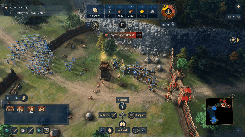 Die größte Überraschung liefert jedoch die Steuerung. Echtzeitstrategie galt auf Konsolen lange als schwierig umzusetzen, doch Age of Empires IV zeigt eindrucksvoll, dass dieses Problem längst gelöst ist. Das gesamte Interface wurde für den DualSense-Controller neu gedacht. Mit einem intuitiven Radialmenü lassen sich Bau-, Forschungs- und Truppenbefehle direkt abrufen. Gebäude werden präzise platziert, Einheiten gezielt gesteuert und Aufgaben intelligent automatisiert. Dorfbewohner kümmern sich selbstständig um Ressourcen, und im Stadtzentrum kann eingestellt werden, dass automatisch neue Arbeiter ausgebildet werden. Das reduziert Mikromanagement spürbar und erlaubt es, sich stärker auf Strategie und Taktik zu konzentrieren. Nach einer kurzen Eingewöhnungsphase geht alles fließend von der Hand, unterstützt durch haptisches Feedback, das Schlachten, Bauarbeiten und sogar den Aufstieg in ein neues Zeitalter fühlbar macht.