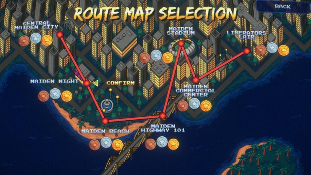 Die Handlung ist einfach gehalten, aber mit ein paar charmanten Details, die alte Arcade-Spiele und Trash-Actionfilme heraufbeschwören. Maiden City wird bedroht von einer geheimen Verbrecherorganisation namens “The Liberators”, die durch Gewalt, Angst und Chaos Kontrolle über die Bürger gewinnen will. Dagegen stehen drei Polizistinnen, die sich als Maiden Cops verstehen: Priscilla, Nina und Meiga. Priscilla ist die junge, idealistische Neulingin, voller Energie und noch etwas naiv; Nina ist die erfahrene, die Führung übernimmt, gelegentlich entspannt, aber wenn es drauf ankommt, effizient; Meiga stammt aus einer Familie mit Kampferfahrung, ist stark, aber durch ihre Holstaur-Herkunft auch schüchtern und sanft im Gemüt – ein netter Kontrast. Die Konflikte entstehen klassisch durch den Kampf gegen die Liberators, deren Machenschaften in den Straßen, Gassen und Untergründen von Maiden City sich entfalten – von Gangs über Korruption bis hin zu übertriebenen Monstergirls als Gegner, was dem Spiel einen eher leichtfertigen, spielerischen Ton gibt. Wer etwa an Streets of Rage, Final Fight oder auch neuere Indie-Titel wie River City Girls denkt, wird Parallelen finden – sowohl was den Humor als auch was die Action angeht.