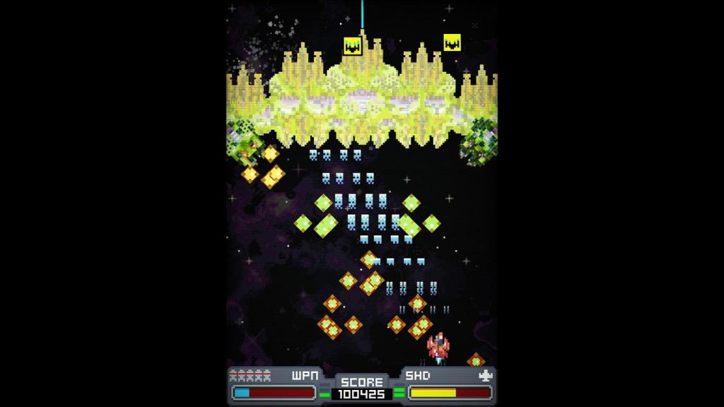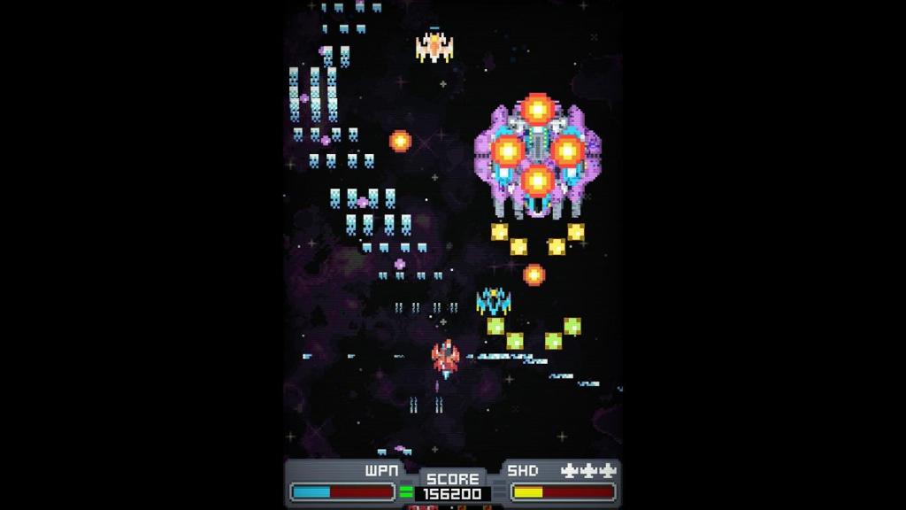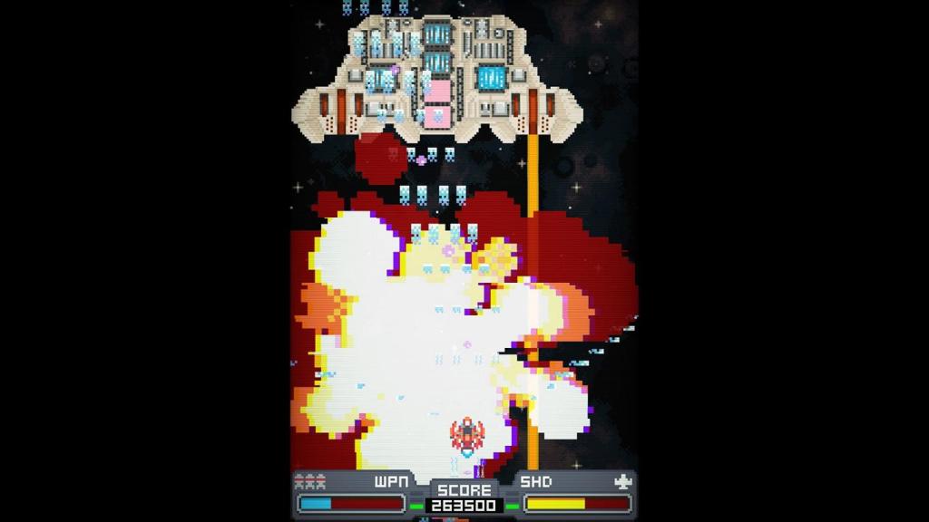 Unterstützt wird der Spieler durch mehrere Fähigkeiten. Gegner lassen gelegentlich Upgrades fallen, die die Feuerkraft des eigenen Schiffs verbessern. Zusätzlich verfügt das Schiff über eine Mega-Bomb-Attacke, deren Energie sich im Verlauf der Kämpfe auflädt. Wird sie ausgelöst, kann sie größere Gegnergruppen oder besonders gefährliche Situationen auf einen Schlag entschärfen. Ergänzend existiert ein temporäres Superschild, das als defensive Notlösung dient, wenn das Bildschirmgeschehen besonders chaotisch wird.