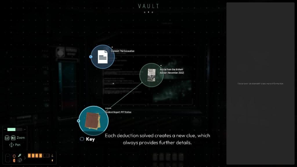 Der eigentliche Kern von Cosmic Abyss ist aber das Rätseldesign und das ist sagen wir mal: kompromisslos. Es handelt sich um ein First-Person-Puzzlespiel, das dich kaum an die Hand nimmt. Stattdessen wirst du mit komplexen Mechaniken konfrontiert, allen voran Noahs Sonar-System. Damit kannst du Frequenzen nutzen, um Objekte aufzuspüren oder sogar ihre Form zu manipulieren. Eine coole Idee, die aber leider oft unnötig umständlich umgesetzt ist. Das Spiel erklärt viele seiner Systeme nur oberflächlich, wodurch man sich häufig eher durchprobiert als logisch vorgeht. Dazu kommt das „Vault“-System, eine Art Gedankenpalast, in dem du Hinweise kombinierst und Schlussfolgerungen ziehst. Klingt spannend, fühlt sich aber oft fummelig an. Gerade wenn man schon länger an einem Rätsel sitzt, wird dieses System eher zur Geduldsprobe als zur Hilfe. Und genau hier zeigt sich das größte Problem des Spiels: Es will clever sein, ist dabei aber manchmal einfach nur überladen.